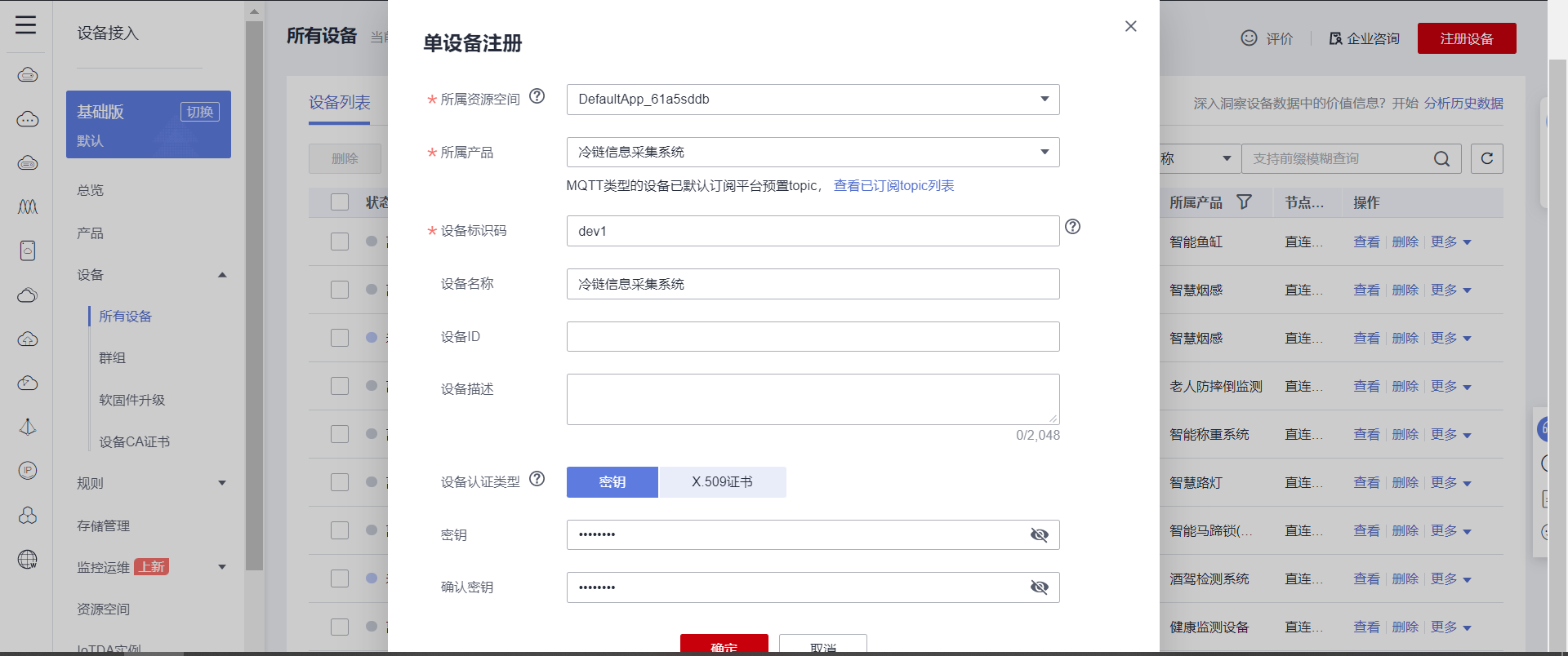 根据提示填入信息,然后生成三元组信息即可。 这里填入的信息就是在创建设备的时候生成的信息。