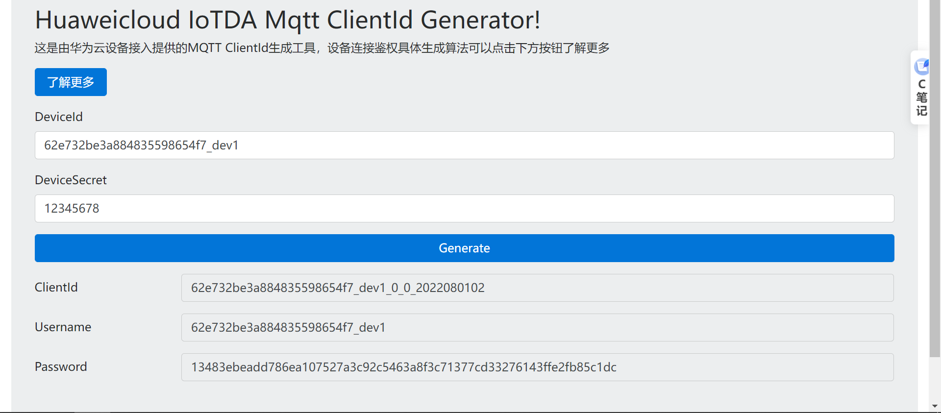 在这里可以使用华为云提供的工具快速得到MQTT三元组进行登录。