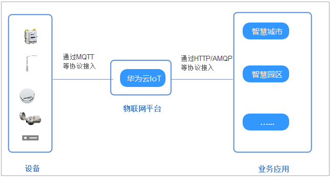 业务应用通过调用物联网平台提供的API,实现设备数据采集、命令下发、设备管理等业务场景。