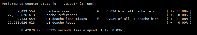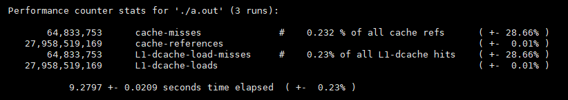 $ sudo perf stat -r 3 -e cache-misses,cache-references,L1-dcache-load-misses,L1-dcache-loads ./a.out