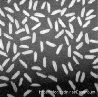 假设存在一张光照不均匀的米粒图像,如图所示,我们需要调用图像顶帽运算解决光照不均匀的问题。其Python代码如下所示:
