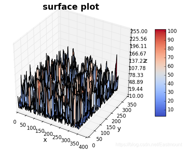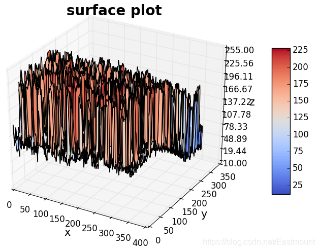 # -*- coding: utf-8 -*- import numpy as np import cv2 as cv import matplotlib.pyplot as plt from mpl_toolkits.mplot3d import Axes3D from matplotlib import cm from matplotlib.ticker import LinearLocator, FormatStrFormatter #读取图像 img = cv.imread("test06.png") img = cv.cvtColor(img,cv.COLOR_BGR2GRAY) imgd = np.array(img) #image类转numpy #准备数据 sp = img.shape h = int(sp[0]) #图像高度(rows) w = int(sp[1]) #图像宽度(colums) of image #绘图初始处理 fig = plt.figure(figsize=(16,12)) ax = fig.gca(projection="3d") x = np.arange(0, w, 1) y = np.arange(0, h, 1) x, y = np.meshgrid(x,y) z = imgd surf = ax.plot_surface(x, y, z, cmap=cm.coolwarm) #自定义z轴 ax.set_zlim(-10, 255) ax.zaxis.set_major_locator(LinearLocator(10)) #设置z轴网格线的疏密 #将z的value字符串转为float并保留2位小数 ax.zaxis.set_major_formatter(FormatStrFormatter('%.02f')) # 设置坐标轴的label和标题 ax.set_xlabel('x', size=15) ax.set_ylabel('y', size=15) ax.set_zlabel('z', size=15) ax.set_title("surface plot", weight='bold', size=20) #添加右侧的色卡条 fig.colorbar(surf, shrink=0.6, aspect=8) plt.show()