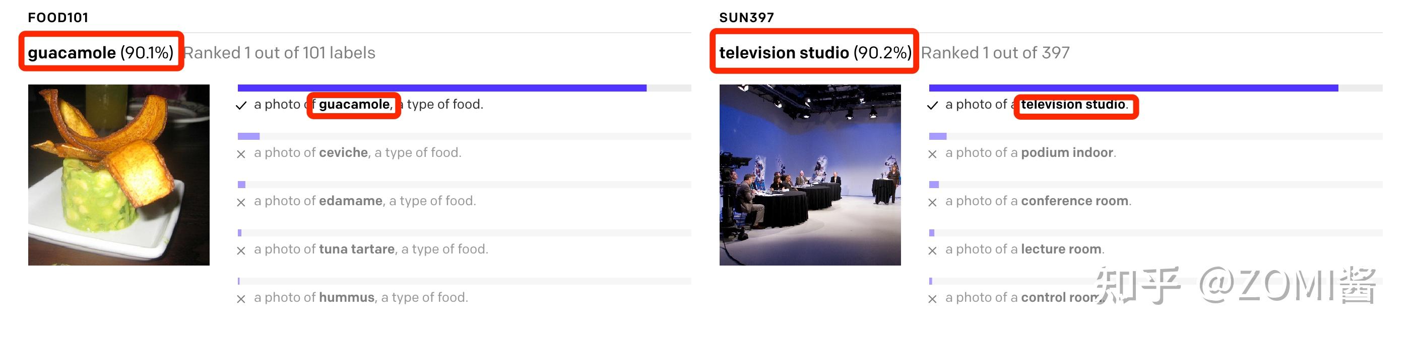 在推理阶段,无论来了张什么样的图片,只要扔给 Image Encoder 进行特征提取,会生成一个一维的图片特征向量,然后拿这个图片特征和 N 个文本特征做余弦相似度对比,最相似的即为想要的那个结果,比如这里应该会得到 “A photo of a guacamole.”,