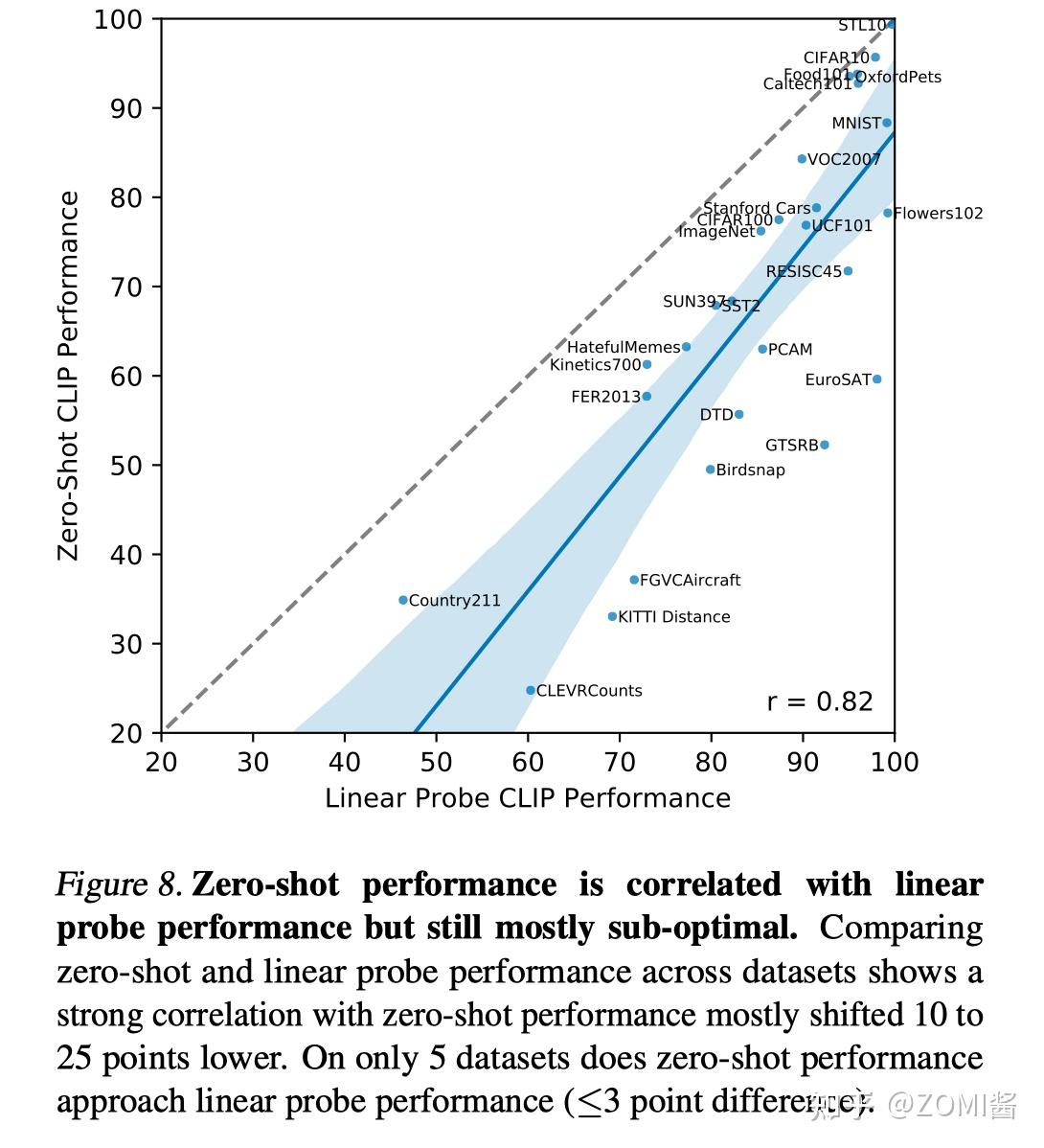 这里不再是few-shot linear probing了,而是全量数据的linear probing,我们来看下其跟zero-shot性能的对比,实际上两者的性能是正相关的,此外,大部分情况下linear probing的性能要好不少。