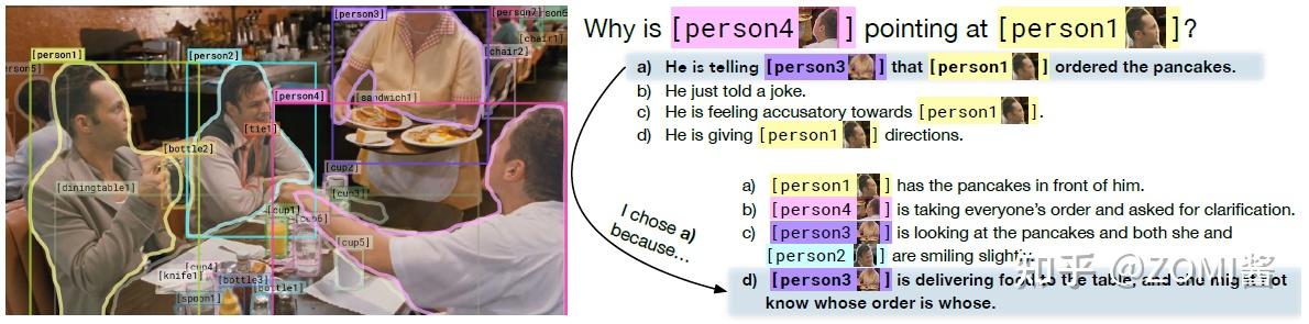 - 视觉推理(Visual Reasoning,VR):视觉推理相对视觉问答更为复杂, 其可以分解为两个子任务视觉问答(Q->A)和选出答案的原因(QA->R), 除了回答的问题需要用自然语言表达具有挑战性的视觉问题外, 模型还需要解释为什么作出这样的回答, 其最开始由华盛顿大学提出, 同时发布的 VCR 数据集包含 11 万的电影场景和 29 万的多项选择问题。
