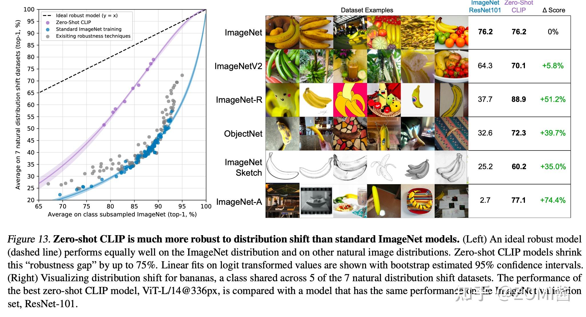 从图中可以看到,在不同的数据集上,CLIP 对比通用的 ResNet50 精度超过的有16/27,已经很强了,因为CLIP是zero-shot的,即没有用下游任务的数据,而linear probed ResNet50用了下游数据进行finetune逻辑回归分类器的参数。