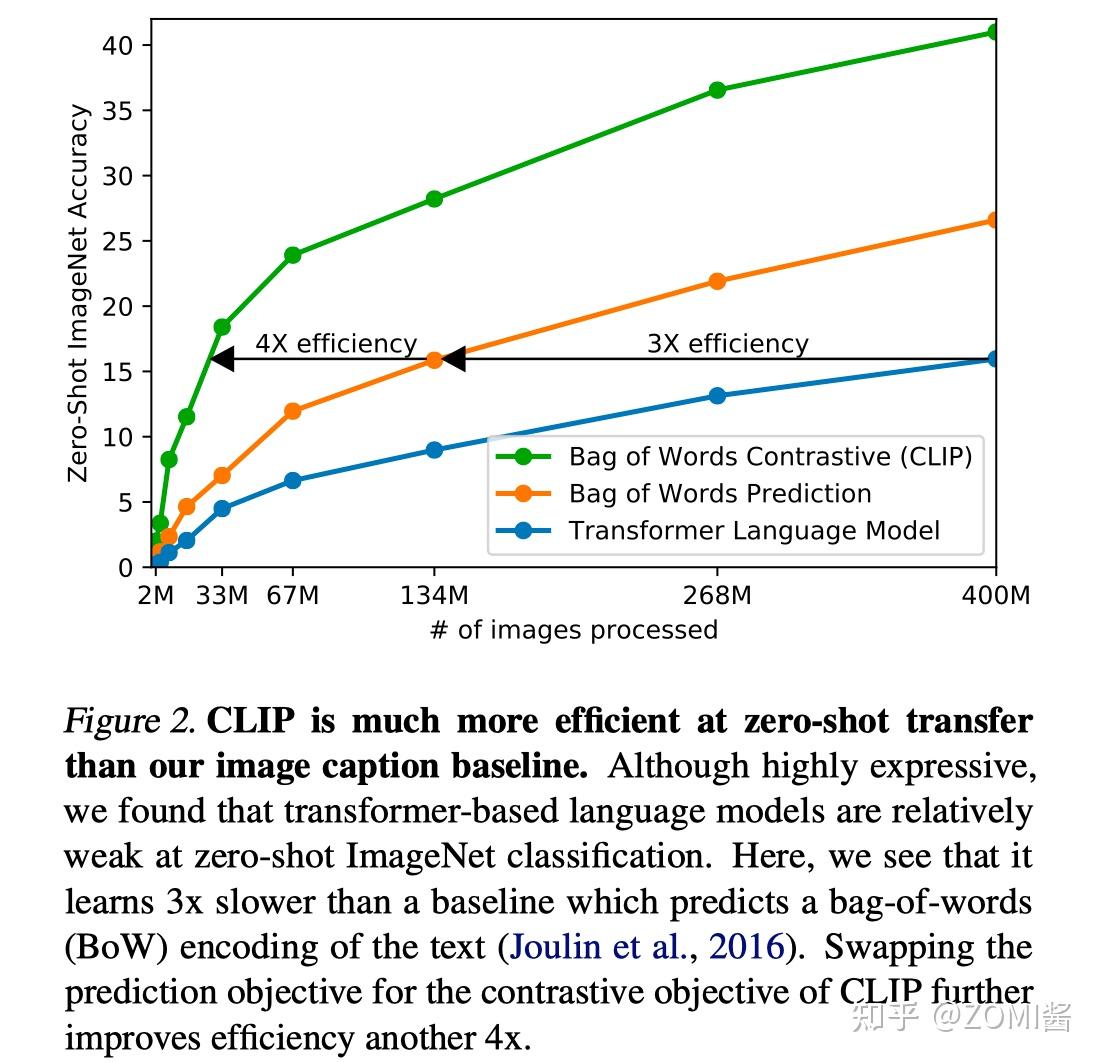 采用对比学习进行训练的一个重要原因也是考虑到训练效率。图中最下面的蓝线表示像 GPT2 这种预测型的任务(NLP预测型的任务是指,现在已经有一张图片拉,去预测图片对应的描述),可以看到是最慢的。中间黄线是指一种 bag of words 的方式,不需要逐字逐句地去预测文本,文本已经抽象成特征,相应的约束也放宽了,这样做训练速度提高了 3 倍。接下来进一步放宽约束,不再去预测单词,而是去判断 image-text pairs 是否一对,也就是绿色线的对比学习方法,效率进一步提升 4 倍。