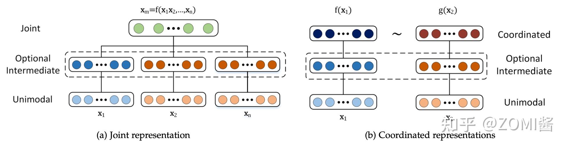 - 协同表示(Coordinated Representations):将多模态中的每个模态分别映射到各自的表示空间,但映射后的向量之间满足一定的相关性约束(例如线性相关)。