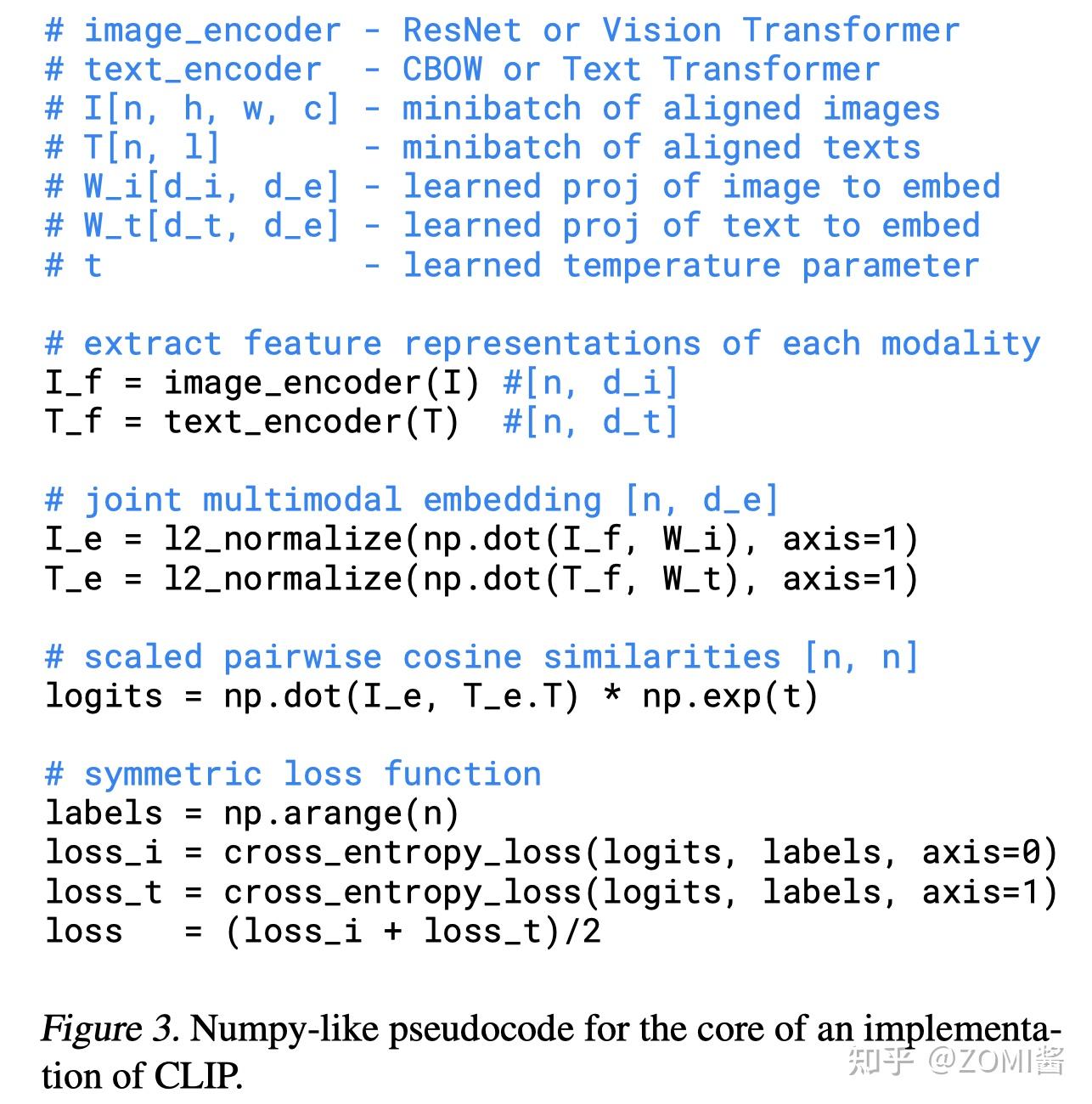 其中重点是分别计算出图像和文本的 embedding 特征 I_e 和 T_e,通过矩阵乘法 dot 得到余弦相似度。接下来就是对称损失函数(symmetric loss function),而损失函数则采用对比学习常用的 InfoNCE。