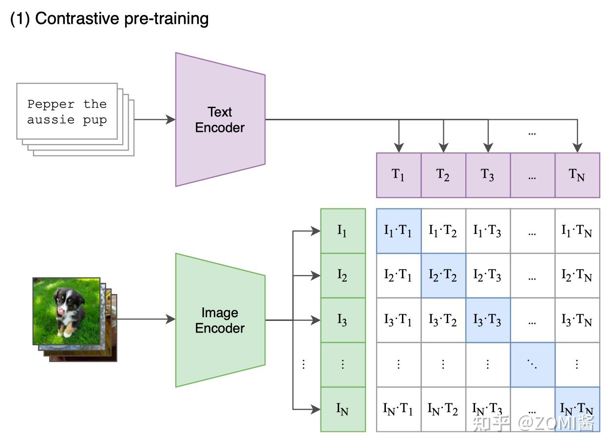 在预训练阶段,对比学习十分灵活,只需要定义好 正样本对 和 负样本对 就行了,其中能够配对的 image-text 对即为正样本。具体来说,先分别对图像和文本提特征,这时图像对应生成 I1、I2 ... In 的特征向量(Image Feature),文本对应生成 T1、T2 ... Tn 的特征向量(Text Feature),中间对角线为正样本,其余均为负样本。