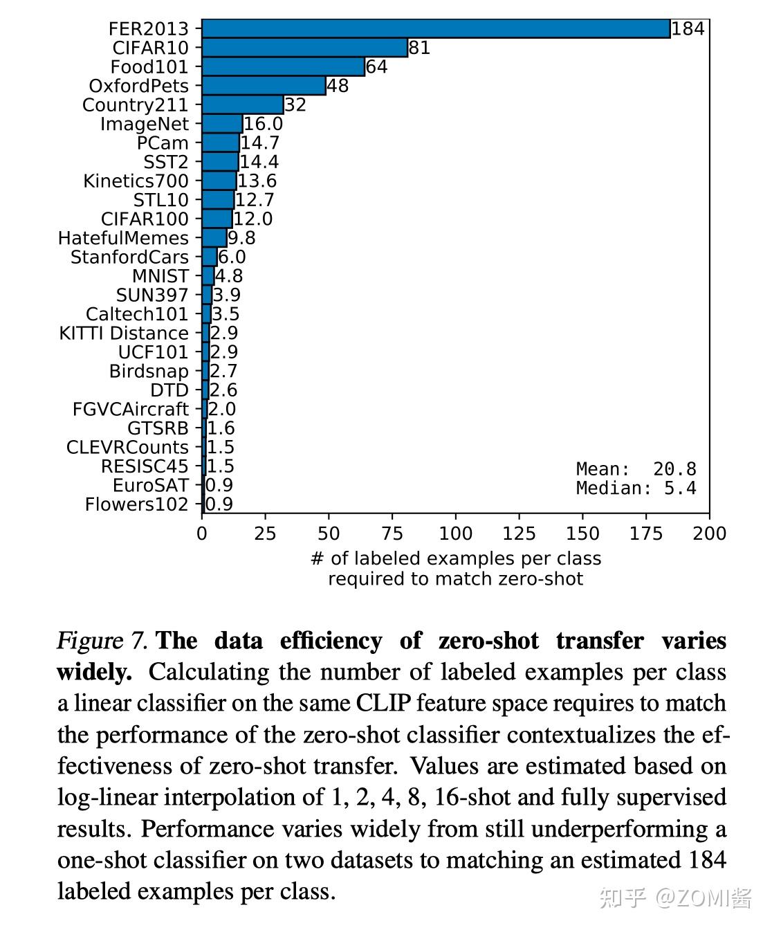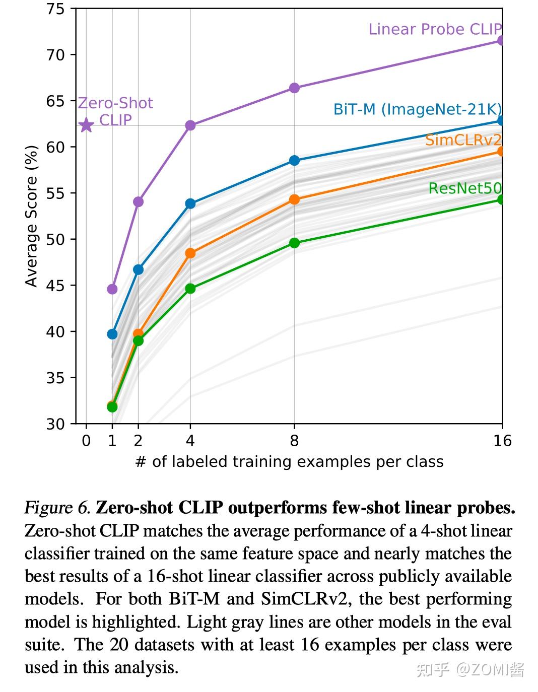 Few-shot (linear probing) CLIP (保持CLIP encoder 参数fixed,加一层逻辑回归分类器微调)平均需要 20.8-shots 才能 match zero-shot CLIP 性能。这里相当于保持了 the same CLIP feature space 上,观察 few-shot finetuning 和zero-shot 的性能差异。这里其实说明通过自然语言学到的视觉概念比少量样本 finetune 学到的好。