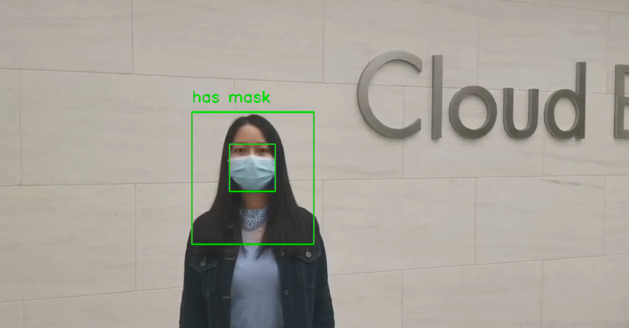 def draw_mask_info(self, image, bboxes): '''在图中画出口罩佩戴信息''' thickness = 2 font_scale = 1 text_font = cv2.FONT_HERSHEY_SIMPLEX for bbox in bboxes: label_index = int(bbox[5]) if self.labels[label_index] != 'head': continue x_min, y_min, x_max, y_max = bbox[0], bbox[1], bbox[2], bbox[3] face_bbox = self.find_max_cover_bbox( bbox, bboxes, 'face', self.face_cover_ratio) if not face_bbox: cv2.rectangle(image, (x_min, y_min), (x_max, y_max), (255, 255, 0), thickness) cv2.putText(image, 'unknown', (x_min, y_min-20), text_font, font_scale, (255, 255, 0), thickness) continue mask_bbox = self.find_max_cover_bbox( face_bbox, bboxes, 'mask', self.mask_cover_ratio) if not mask_bbox: cv2.putText(image, 'no mask', (x_min, y_min-20), text_font, font_scale, (255, 0, 0), thickness) cv2.rectangle(image, (x_min, y_min), (x_max, y_max), (255, 0, 0), thickness) else: cv2.putText(image, 'has mask', (x_min, y_min-20), text_font, font_scale, (0, 255, 0), thickness) cv2.rectangle(image, (x_min, y_min), (x_max, y_max), (0, 255, 0), thickness) cv2.rectangle(image, (mask_bbox[0], mask_bbox[1]), (mask_bbox[2], mask_bbox[3]), (0, 255, 255), thickness) return image