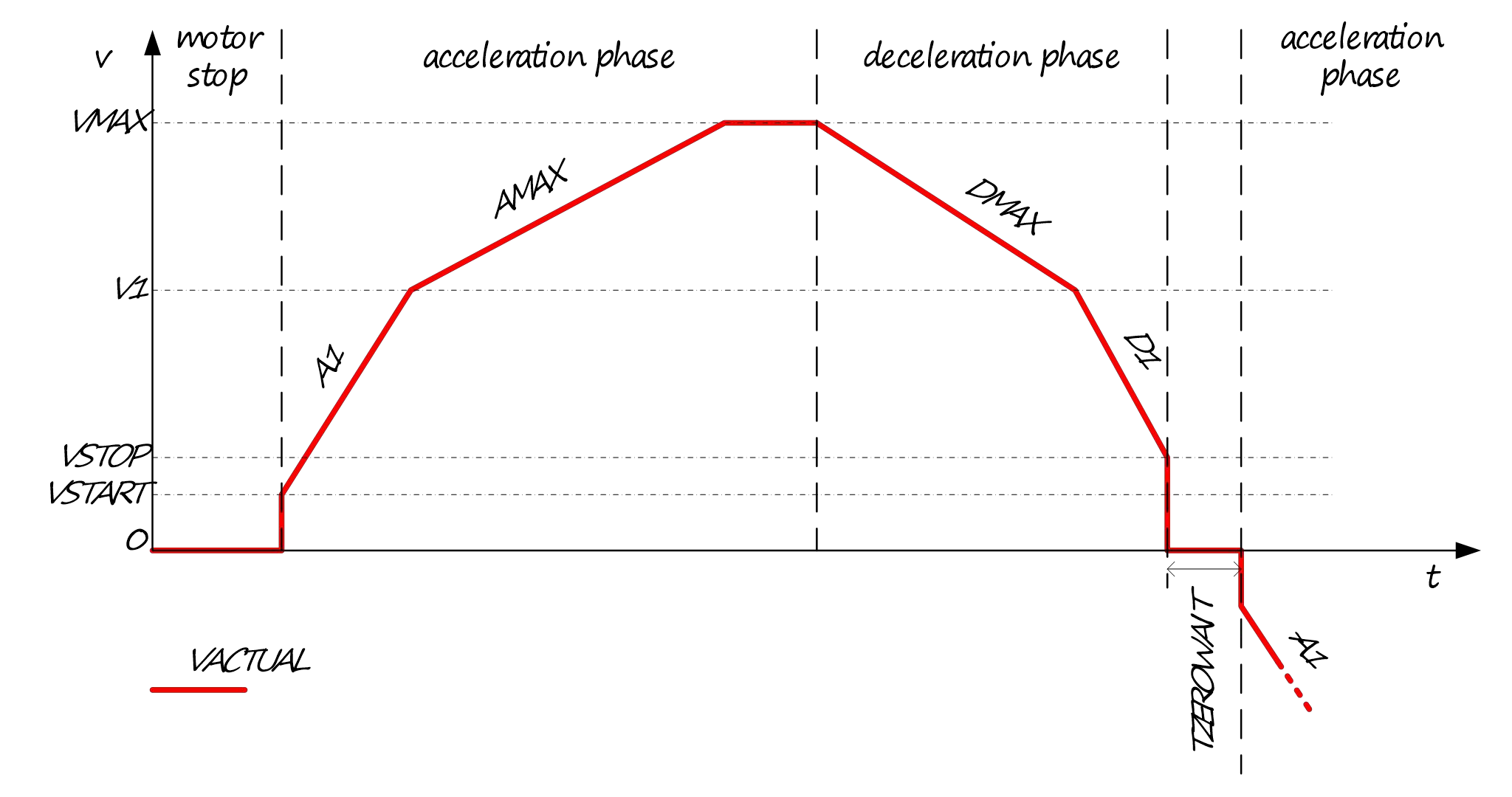 如果是速度模式运行,不需要设置目标位置,电机就会开始转动。如果是位置模式,则需要设置目标位置,且目标位置与电机当前位置值不同电机才会转动。下图中的红线是电机的实际速度,不管是速度模式还是位置模式,电机的运行过程会按照下图来进行。