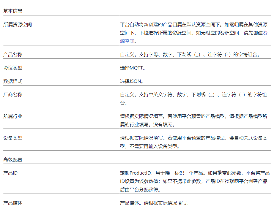 在产品列表中,单击对应的产品,进入产品详情页。您可以查看产品ID、产品名称、设备类型、数据格式、厂商名称、所属资源空间、协议类型等产品基本信息。其中产品ID(product Id)是物联网平台自动生成的,其余信息均是由用户创建产品时自定义。