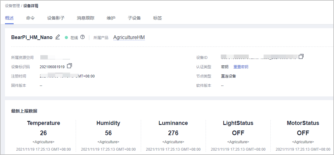 登录平台可以看见数据上报的具体信息,也可以进行命令下发等操作控制设备,具体如下图11-13。