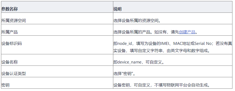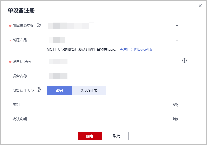 - 在左侧导航栏选择“ 设备 > 所有设备”,单击右上角“注册设备”,按照如下表格填写参数后,单击“确定”。