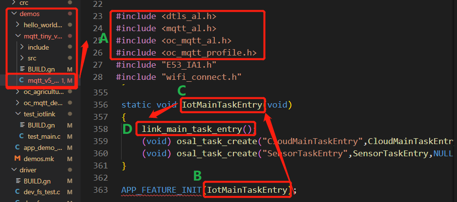图9中A区域表示MQTT对接华为云所必须的一些库文件以及dtls的库文件,入口函数IoTMainTaskEntry()中务必先调用link_main_task_entry()函数,来确保osal的安装以及其他配置的初始化。