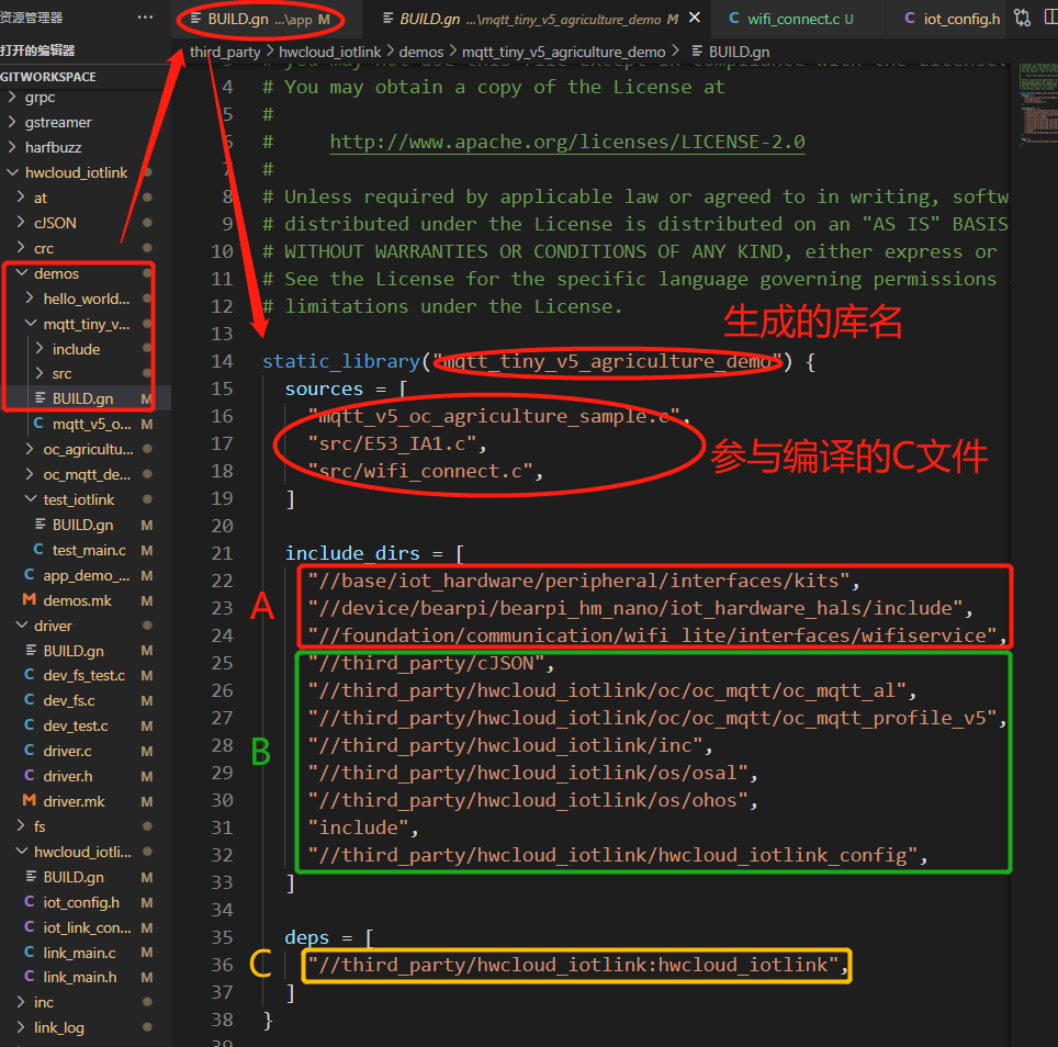 - 图6中2为使用MQTT对接华为云的demo,看一下该demo的BUILD.gn文件,具体如图8所示,其中A区域包含开发板硬件和wifi相关的库文件,B区域包括MQTT对接华为云必须的一些库文件,如cJson,mqtt相关、osal相关以及配置库文件,C区域表示编译该文件时需要编译hwcloud_iotlink库,编译是会按照指定路径找到该文件所必要的库以及C文件进行编译。