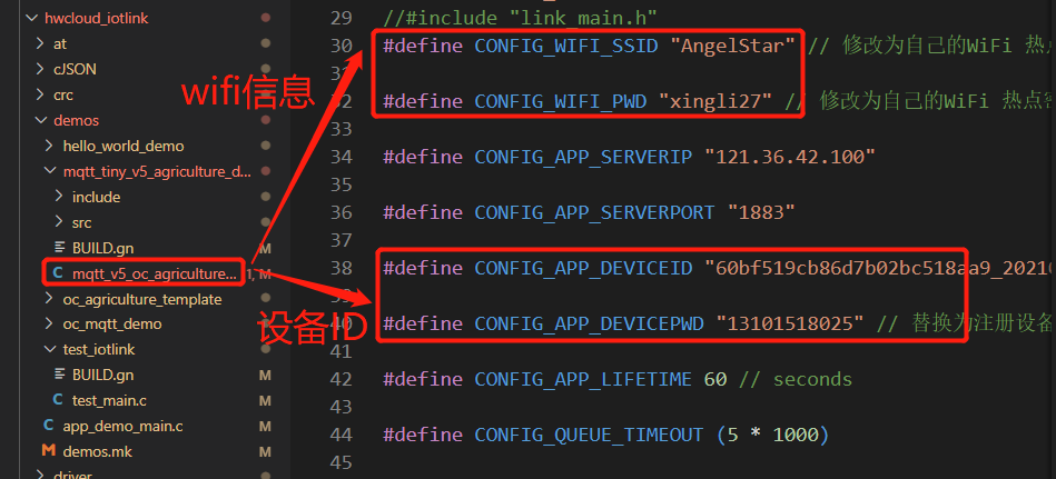 如果需要对接上云需要根据自己的设备修改配网信息,wifi热点账号以及密码以及自己在云端注册的设备ID和设备秘钥,设备仅支持2.4G频段的wifi。