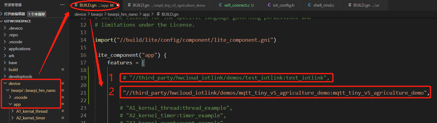 - 在OpenHarmony 3.0源码device\bearpi\bearpi_hm_nano\app\BUILD.gn中添加如下代码,根据#是否注释来决定具体编译demo的选择。