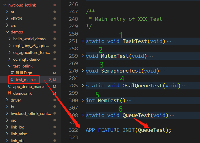 - 图6中1为单元测试代码,可以根据修改test_main.c文件中最后一行代码中,APP_FEATURE_INIT()中的入口函数,来进行不同的测试用例的执行,分别测试OSAL层不同的组件适配,包括任务、互斥锁、信号量、队列、以及SDK本身队列等一系列验证,部分内容可以对比BearPi-HM_Nano开发板的官方样例代码进行对比验证程序结果的正确性,具体如图7。