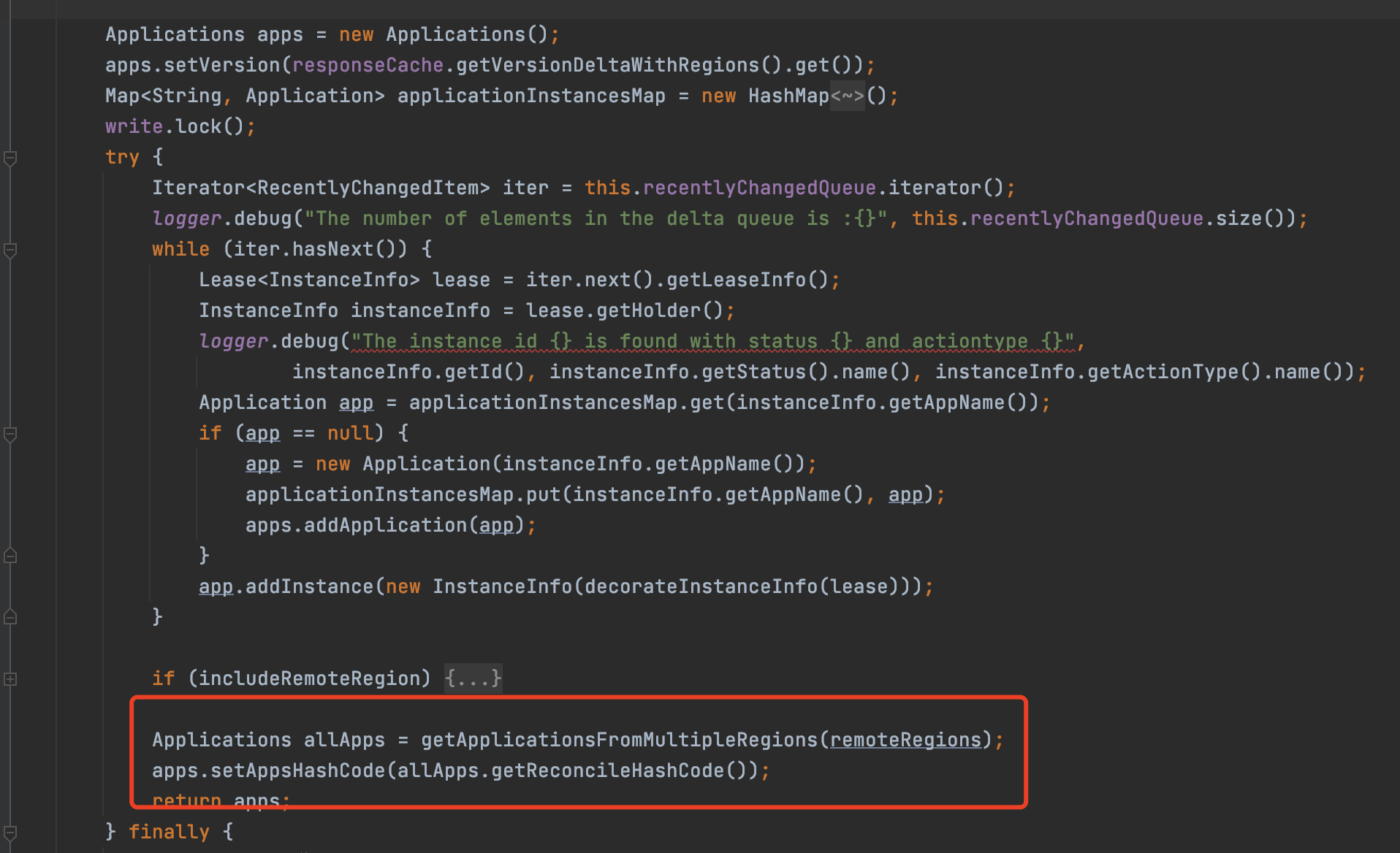 所谓的增量信息,就是返回最近有变动的服务实例,而recentlyChangedQueue刚刚好保存了最近的服务实例的信息,所以这个方法的实现就是遍历recentlyChangedQueue,取出最近有变动的实例,返回。所以保存最近变动的实例,其实是为了增量拉取做准备的。