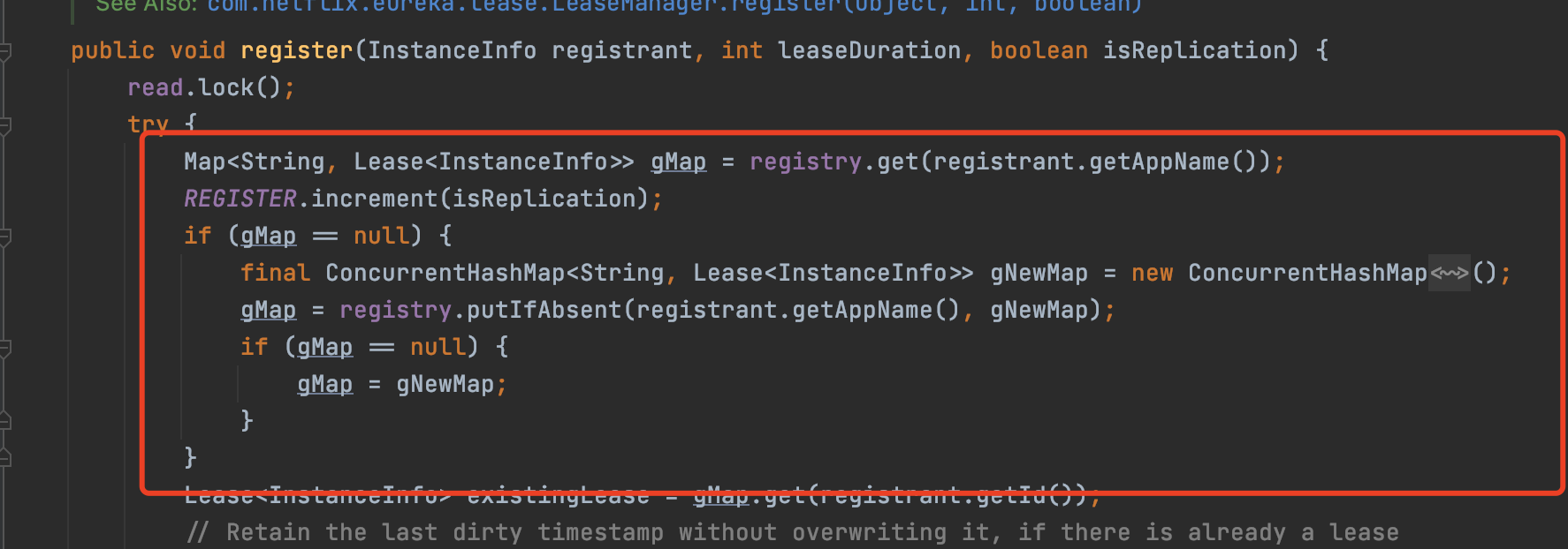 如上图,AbstractInstanceRegistry是注册中心的服务注册核心实现类,这里面保存了服务实例的数据,封装了对于服务实例注册、下线、读取等核心方法。