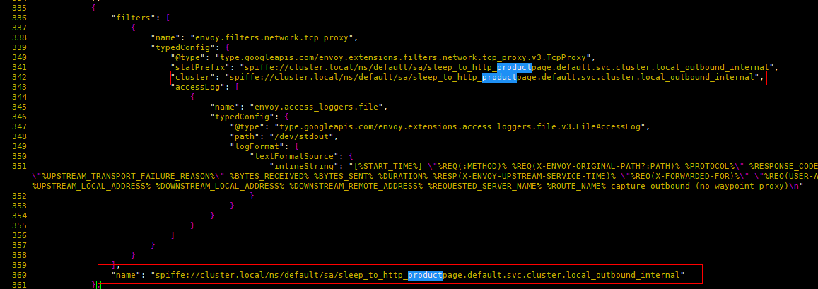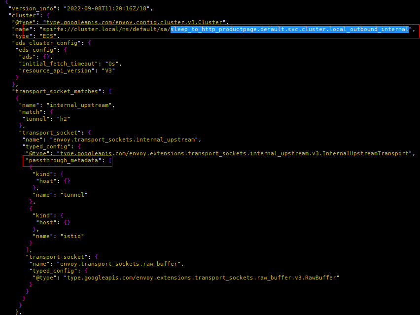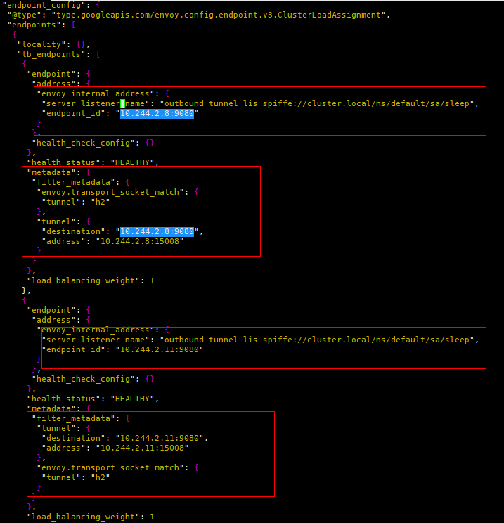(3)"spiffe://cluster.local/ns/default/sa/sleep_to_http_productpage.default.svc.cluster.local_outbound_internal"过滤器关联到同名的Cluster。该Cluster一共包含两个Endpoint实例,根据负载均衡算法选择某一个Endpoint,并且最重要的是将metadata(tunnel的destination和address)传递给名为"outbound_tunnel_lis_spiffe://cluster.local/ns/default/sa/bookinfo-productpage" 的监听器处理。