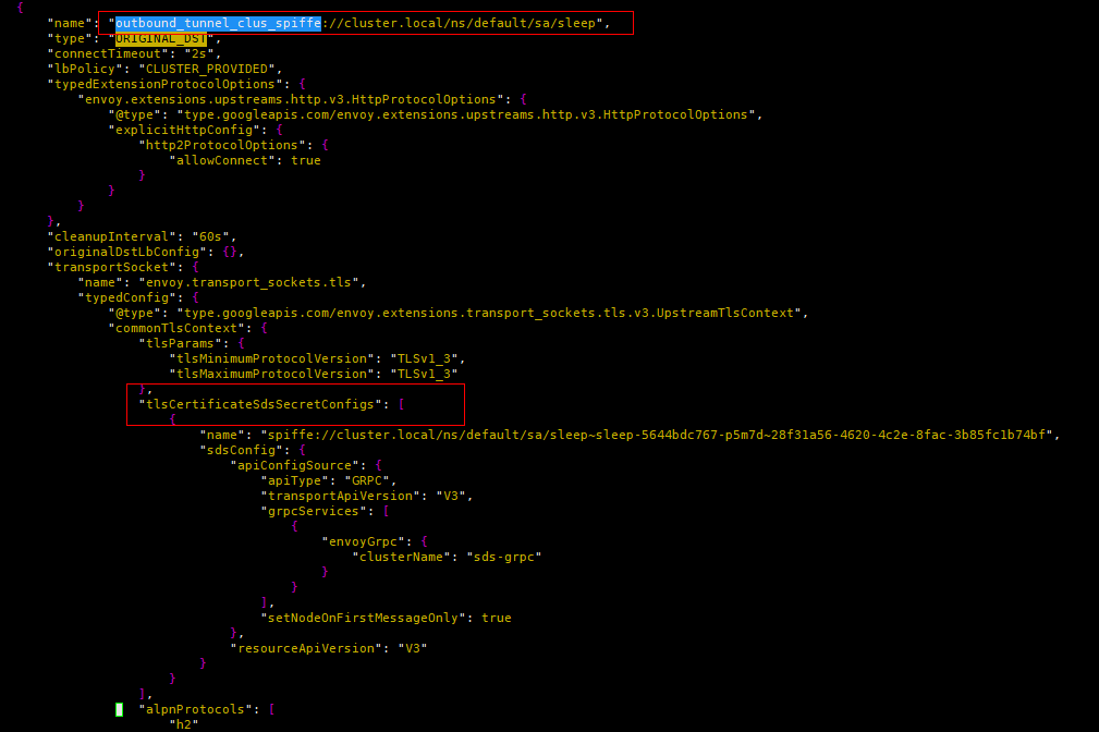 outbound_tunnel Cluster的类型为“ORIGINAL_DST”,并且配置有UpstreamTlsContext, 因此它负责流量TLS加密,然后直接发送到目的地址,即10.244.2.8:15008。