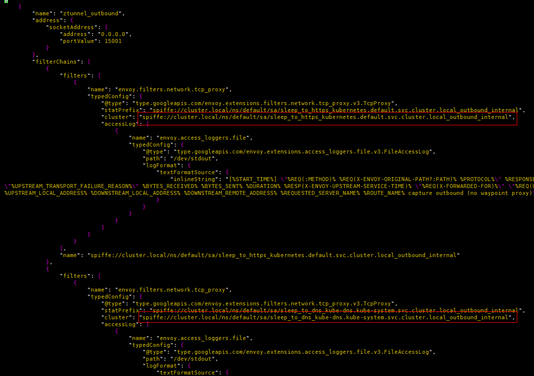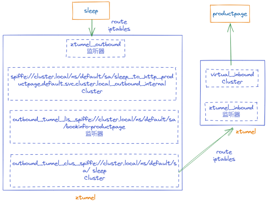 - 发送侧ztunnel:两个监听器和对应的两个cluster