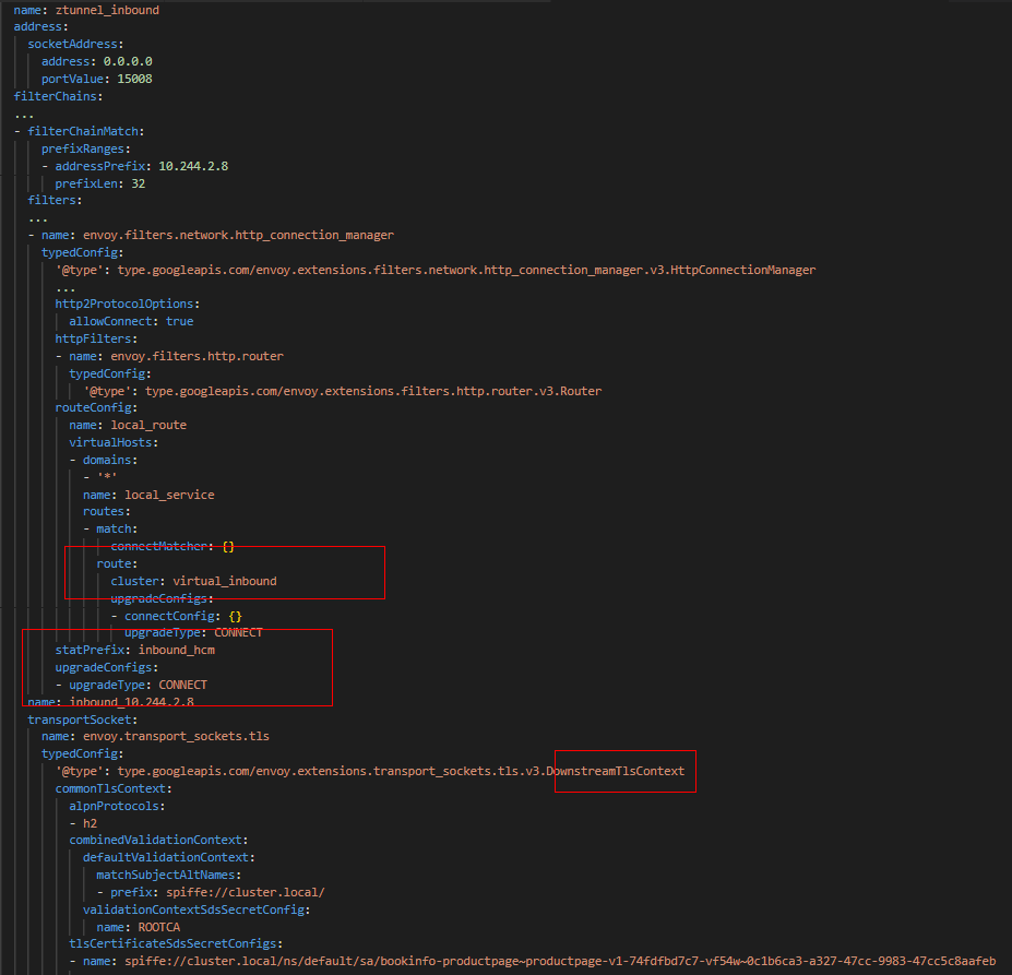 (2)ztunnel上面“ztunnel_inbound”监听器监听在15008端口,因此流量首先经过ztunnel_inbound监听器的处理。ztunnel_inbound监听器上面设置了TLS,根据其配置与下游进行TLS握手,从而所有的ztunnel之间基于双向TLS加密通信。另外,从下面配置中可以看到,CONNECT 升级已经设置,那么Envoy就会代理HTTP的Connect请求。除此之外,RouteMatch中设置了connectMatcher,意味着将HTTP Connect请求交由“virtual_inbound”Cluster处理。