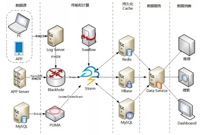 Blackhole是我们团队开发的类Kafka系统,主要目标是批量从业务方拉取日志时做到数据的完整性和一致性,然后也提供了实时的消费能力。 Puma是以MySQL binlog为基础开发的,这样可以实时拿到数据库的update、delete、insert操作。 Swallow是点评的MQ系统 。