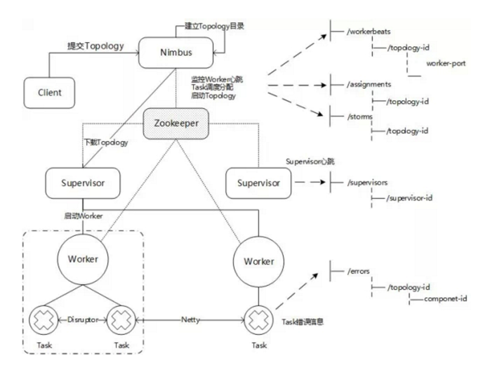 刚刚介绍了一些Storm的基础概念和特性,再用一张比较完整的图来回顾一下整个Storm的体系架构: