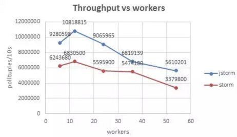 Worker数越多,性能越好?先看一张Worker数量和吞吐量对比的曲线(来源于JStorm文档: jstorm/docs at master · alibaba/jstorm · GitHub 0.9.4.1jstorm性能测试.docx)。