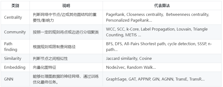除了明确规则的查询外,我们也可以利用图算法对图进行分析。毕竟图中蕴含的信息量远比表面看上去多,这个时候我们希望通过图算法揭示图中更多的信息,如发现节点之间隐含关系,分析节点重要性,对业务场景进行行为预测等。