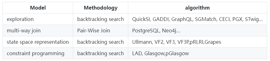 当然了,即使子图查询是一个非常困难的问题,大部分图查询语言还是提供了相应的match语法用于基于模式匹配的搜索功能,如neo4j使用的Cypher,或者支持指令式和声明式查询的Gremlin。而在图算法领域,subgraph matching则是一个极重要,极复杂的研究课题。下表中列出来一部分具有代表性的子图匹配算法的分类。(来源于paper[In-Memory Subgraph Matching: An In-depth Study])。