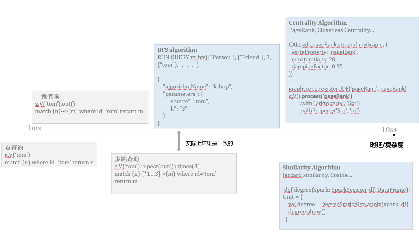 比如上图的多跳查询和BFS algorithm,本质上是同一个查询。灰色模块显示的是gremlin与cypher的查询方法,蓝色模块显示的是不同图数据库中BFS算法的执行方式。但他们的结果都是一致的,均为点Tom的三度邻居。也就是在业界,N跳查询即可以作为广度/深度优先算法/khop算法单列出来,也可以作为图遍历/图查询中一种常用模式存在。
