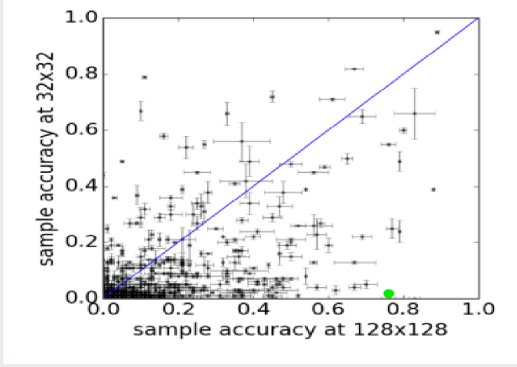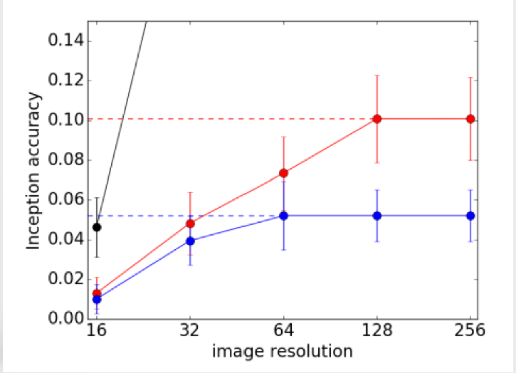 如何评价一个生成模型生成图片的分辨率,最简单的方法无非就是直观用眼睛来看,但这样显然无法量化一个图片的好坏,于是作者提出使用一个分类器,若生成的图片具有较高的分类正确率,就有理由认为生成的图片质量比较高,也即该图片具有较高的可分辨性,如上所述,生成高分辨率的图片,需要不是简单的将低分辨率的图片进行线性插值来生成,因而要量化的分析生成的图片的质量,可以从其分辨力。