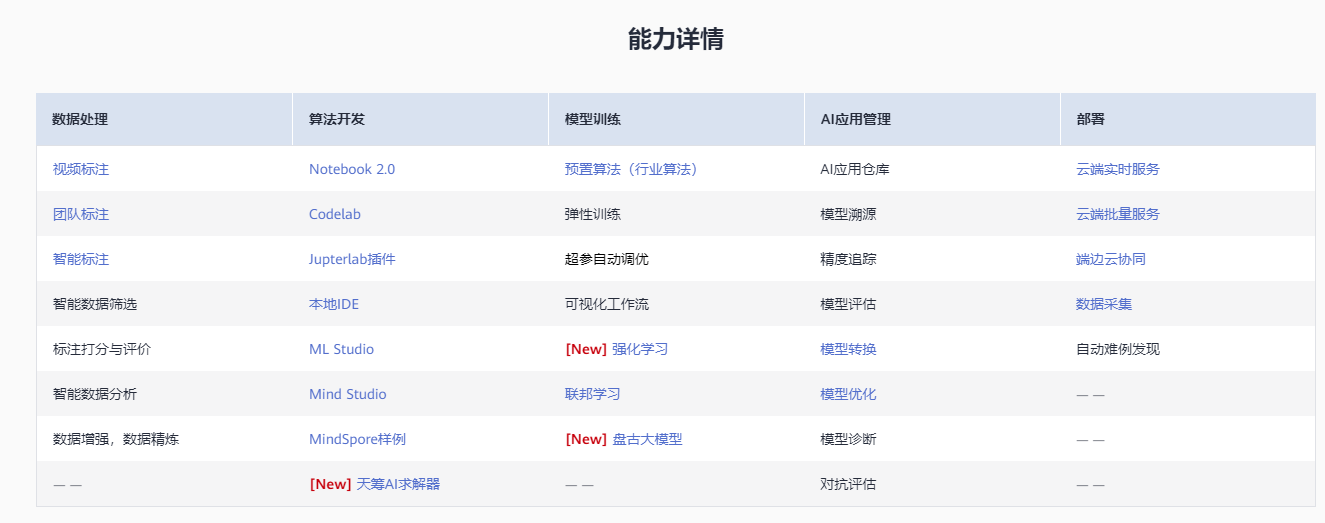 ModelArts 是面向开发者的一站式AI开发平台,为机器学习与深度学习提供海量数据预处理及交互式智能标注、大规模分布式训练、自动化模型生成,及端-边-云模型按需部署能力,帮助用户快速创建和部署模型,管理全周期AI工作流。下图就是ModelArts的能力图: