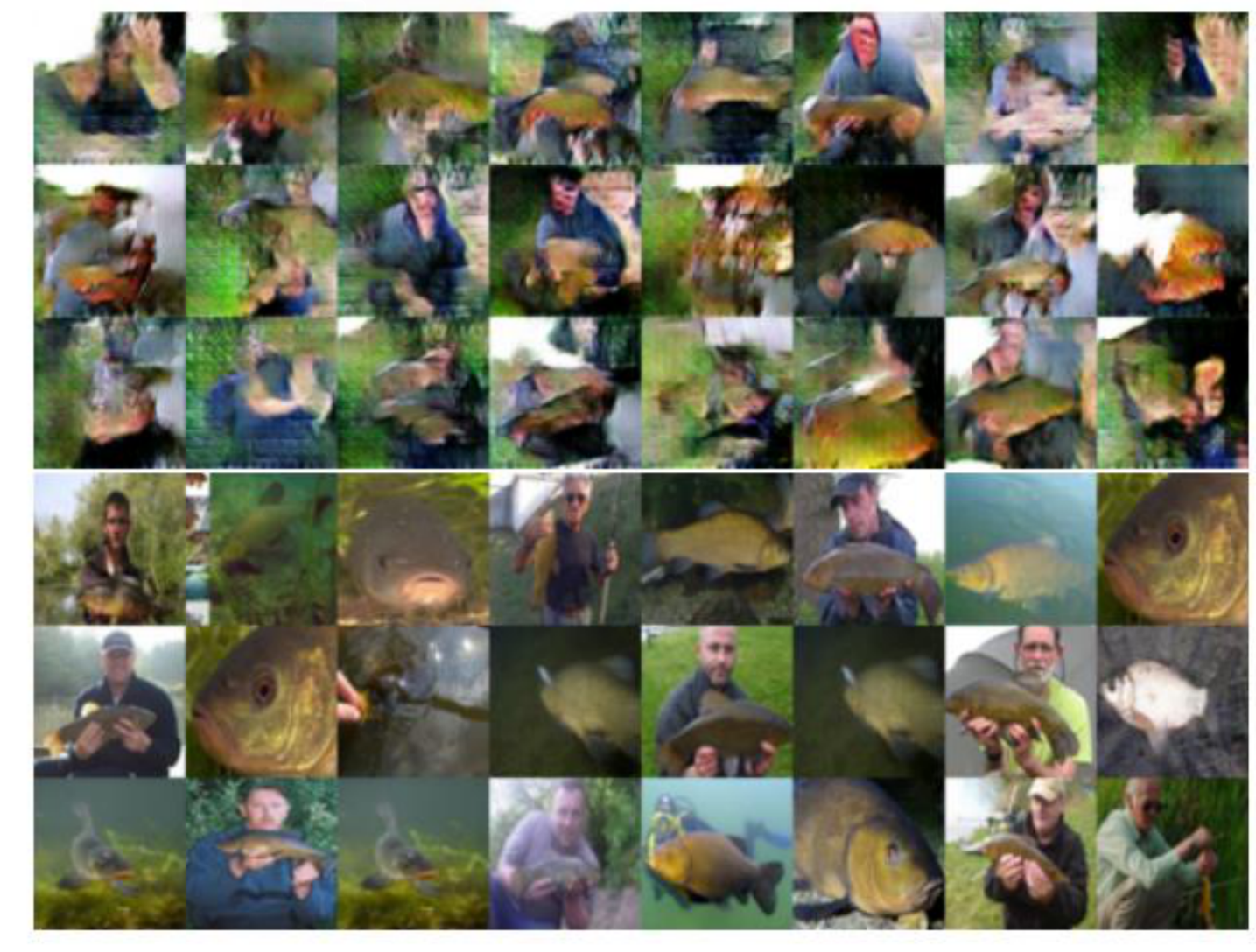 因此,ACGAN提出Inception Accuracy,这种新的用于评判图像合成模型的标准,查看其被分类为正确类别的比率,以此来判定生成的图片质量。图中,最上面给出了真实图片和基于ACGAN生成图片,可以明显感觉图片高分辨率对应高可分辨性。