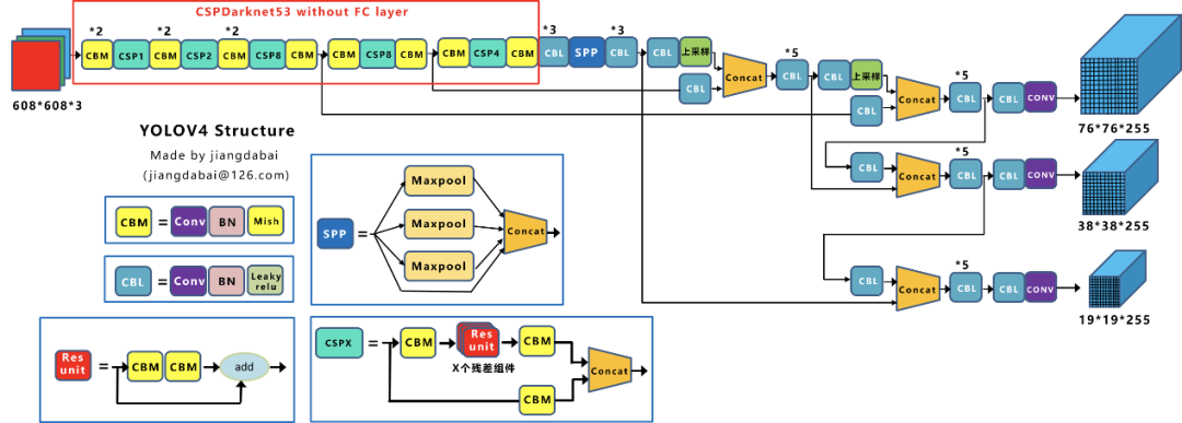 从算法结构方面看,YOLOv4由三部分组成:Backbone层提取特征,Neck层提取一些更复杂的特征,最后由Head层计算预测输出。