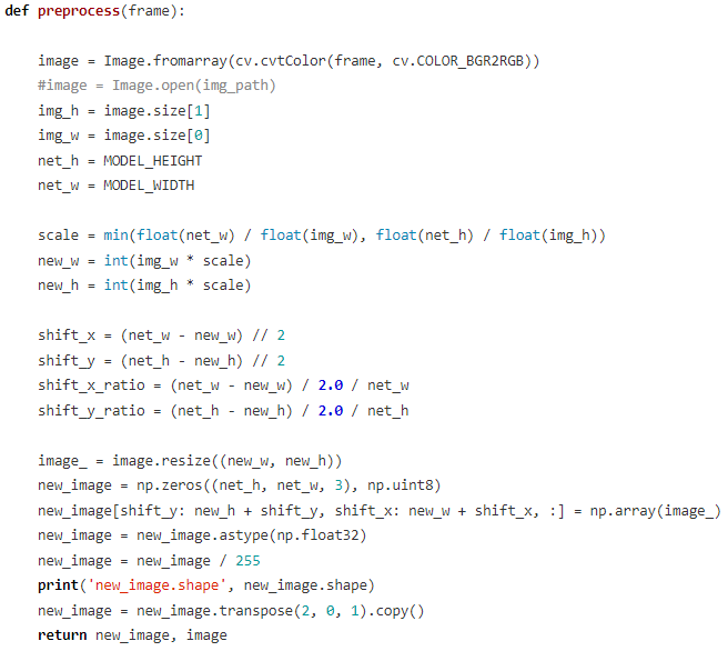 1. 首先将opencv每帧读到的BGR图像转换成RGB图像,并通过模型输入所需宽高与原图像宽高得到缩放系数scale、偏移量shift、偏移系数shift_ratio。