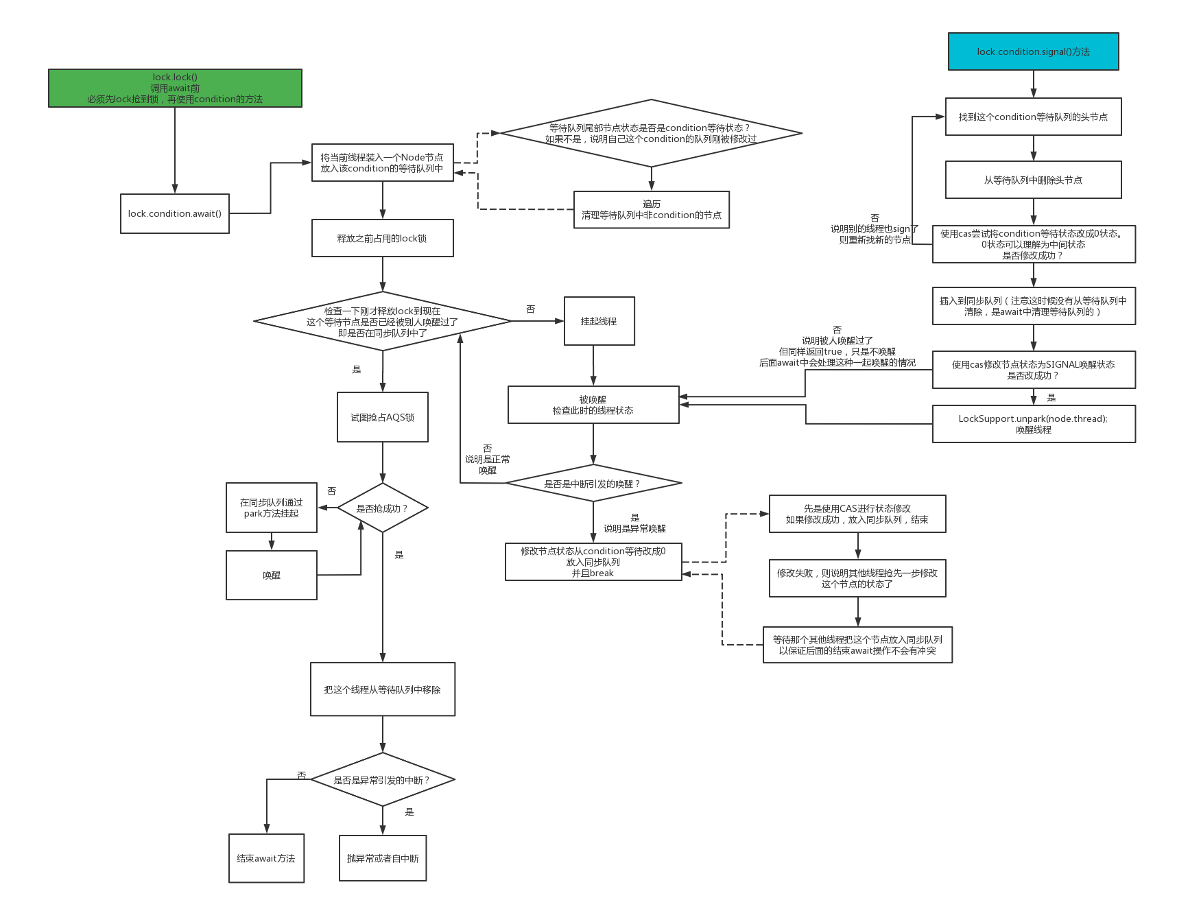 - await(), 简单来讲就是把当前线程放入condition的等待队列中,然后调用LockSupport.park拉起线程。如果被其他线程通过signal唤醒,则放入同步队列中竞争锁,竞争成功则返回,否则继续竞争。