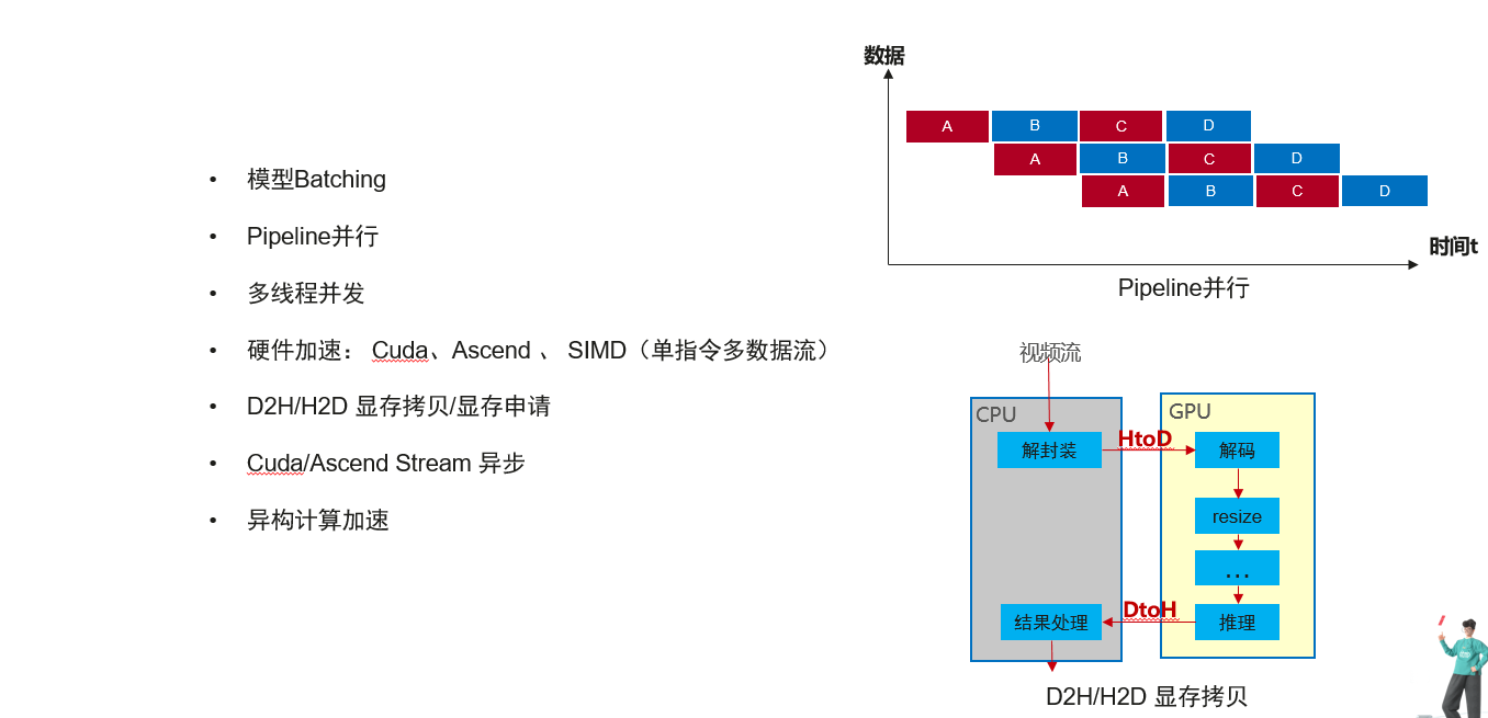 硬件加速:使用硬件的加速能力如Cuda、Ascend 、 SIMD等,与此同时硬件的加速会带来额外的主机到硬件设备的内存拷贝开销。