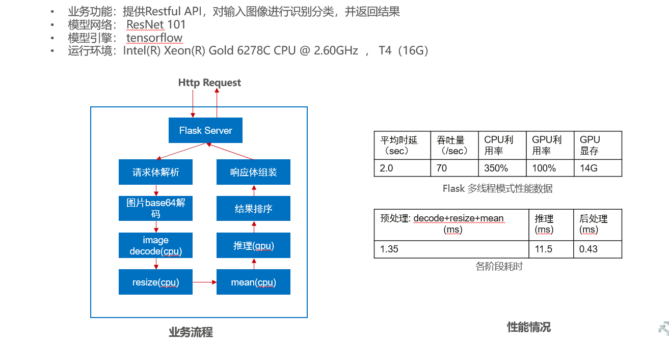 该业务原始代码使用Python语言开发,采用flask框架作为Http Server提供Restful API 对输入图像进行识别分类,模型为ResNet101网络,训练引擎为tensorflow 。具体业务逻辑和性能情况如下图所示: