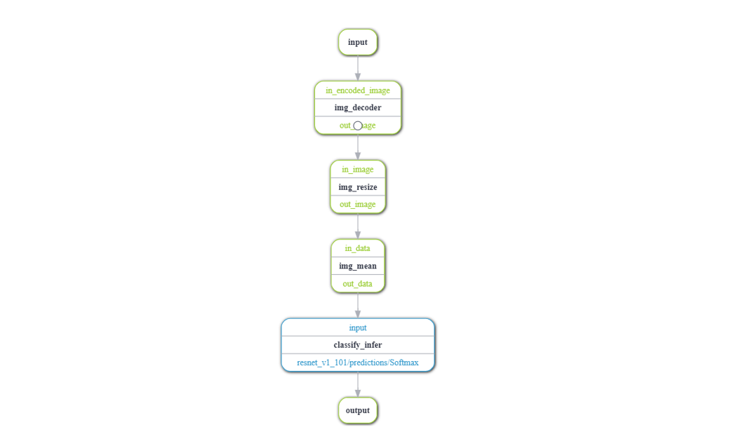 def __init__(self) ... # modelbox self.graph_desc = modelbox.FlowGraphDesc() self.graph_desc.set_drivers_dir(["/home/code/image_classify/classify_infer/"]) self.graph_desc.set_queue_size(64) self.graph_desc.set_batch_size(8) input = self.graph_desc.add_input("input") img_decoder = self.graph_desc.add_node("image_decoder", "cpu",input) img_resize = self.graph_desc.add_node("resize", "cpu", ["image_height=224", "image_width=224"],img_decoder) img_mean = self.graph_desc.add_node("mean", "cpu",["mean=123.68,116.78,103.94" ], img_resize) classify_infer = self.graph_desc.add_node("classify_infer", "cuda", ["batch_size=32"], img_mean) self.graph_desc.add_output("output", classify_infer) self.flow = modelbox.Flow() self.flow.init(self.graph_desc) self.flow.start_run()