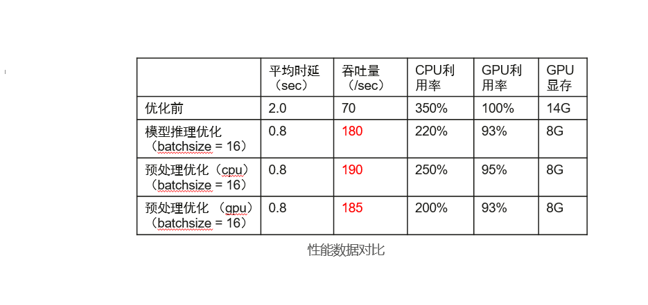 可以看到同为batchsize为16时,通过预处理性能较纯模型推理优化性能有提升,同时全为cpu预处理时反而比gpu预处理性能好。这是因为一方面cpu预处理采用了多线程并发处理,另一方面GPU预处理抢占了GPU资源,影响了推理速度,从而影响整体性能。所以并不推荐所有操作都使用硬件加速,需要具体场景具体分析,保证资源计算的合理分配。