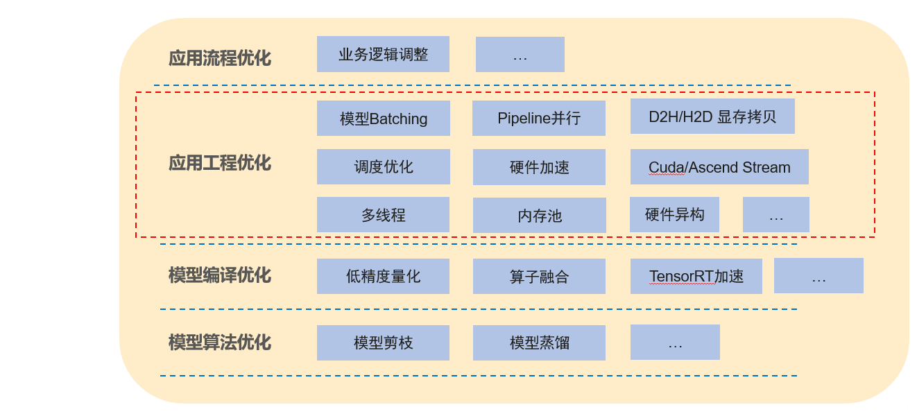 一个AI应用可以分为模型和工程逻辑,AI应用的优化我们也可以从上到下进行划分,其中应用流程优化和应用工程优化为工程方面的优化,模型编译优化和模型算法优化则为模型优化。