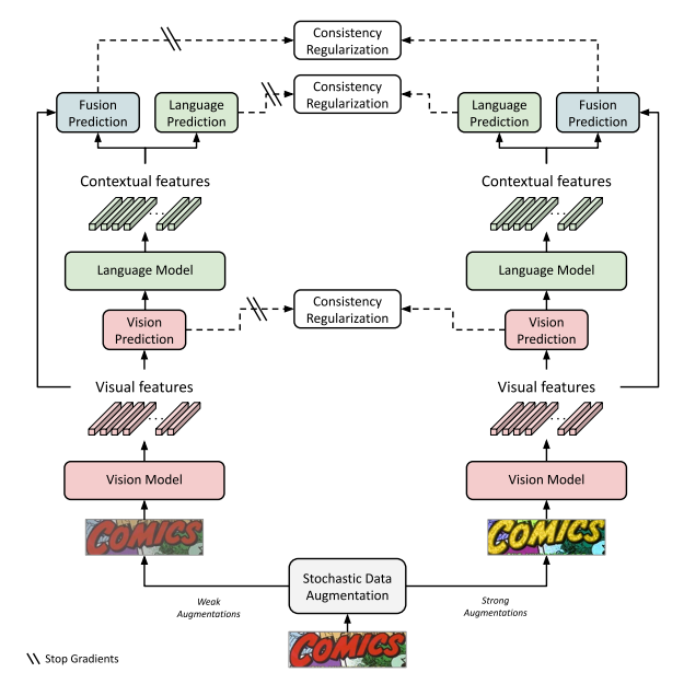 摘要:本文提出了一种针对文字识别的多模态半监督方法,具体来说,作者首先使用teacher-student网络进行半监督学习,然后在视觉、语义以及视觉和语义的融合特征上,都进行了一致性约束。
