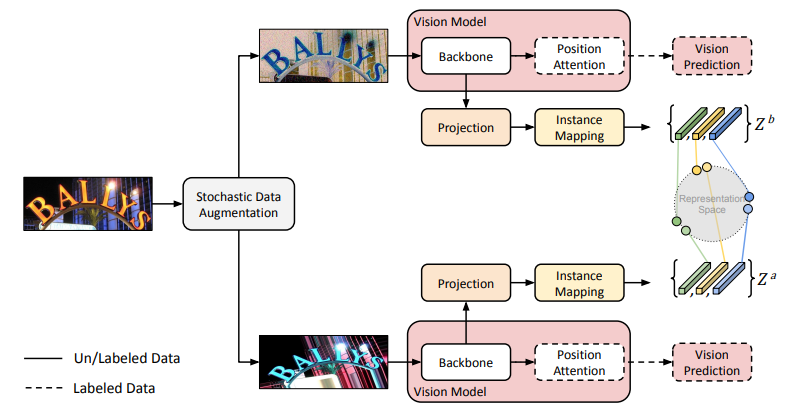 首先,在视觉模型方面,本文提出了一个将自监督预训练和强监督训练结合的单阶段训练模型。然后,语言模型是在一个大型文本语料库上进行自监督预训练。得到两个模态的预训练模型之后,对文字识别进行半监督训练。本文采用的是teacher-student的结构,具体来说,对一张文本图像分别进行弱数据扩增和强数据扩增,然后对两个网络不同模态的输出进行一致性约束。大量实验证实本文的方法优于当前的训练方案,并在多个场景文本识别基准上取得了最先进的结果。